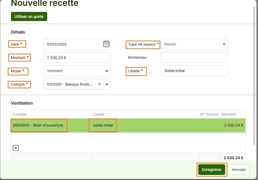 Pour se faire, vous devez créer une recette dans le compte « 890 », puis pointer cette recette dans le tout premier rapprochement.