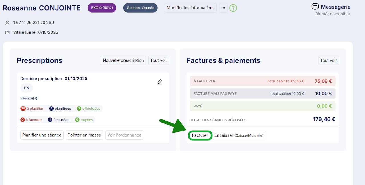 Depuis le menu Patients, cliquez sur le patient, puis cliquez sur le bouton Facturer dans l'encart Factures & Paiements