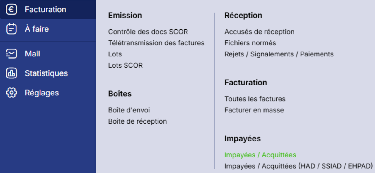 Pour garder un œil sur vos factures et suivre leur règlement, Topaze propose la fonctionnalité Impayées / Acquittées. Rendez-vous dans l'onglet Facturation , puis Impayées/Acquittées.