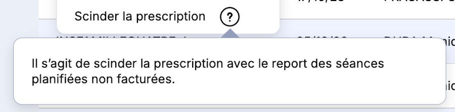 Scinder la prescription, permet de dupliquer la prescription à l’identique afin de lui transférer les séances prévues et non facturées et de tout modifier. La partie de la prescription déjà facturée, est archivée.