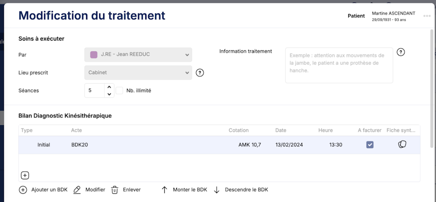 Modifier la prescription vous permet d’ajouter un BDK et/ou modifier le nombre de séances sans devoir scinder la prescription en deux.