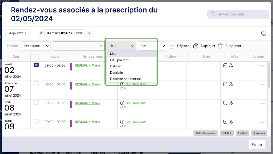 Rendez-vous sur la fiche patient puis cliquez sur Consulter>Rendez-vous. Une fois le rdv coché, sélectionnez l’option Cabinet pour le lieu, afin de ne pas facturer le déplacement.