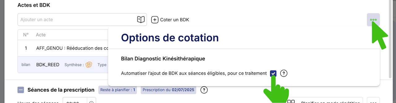 Cochez l’option : « Automatiser l’ajout de BDK aux séances éligibles pour ce traitement ».